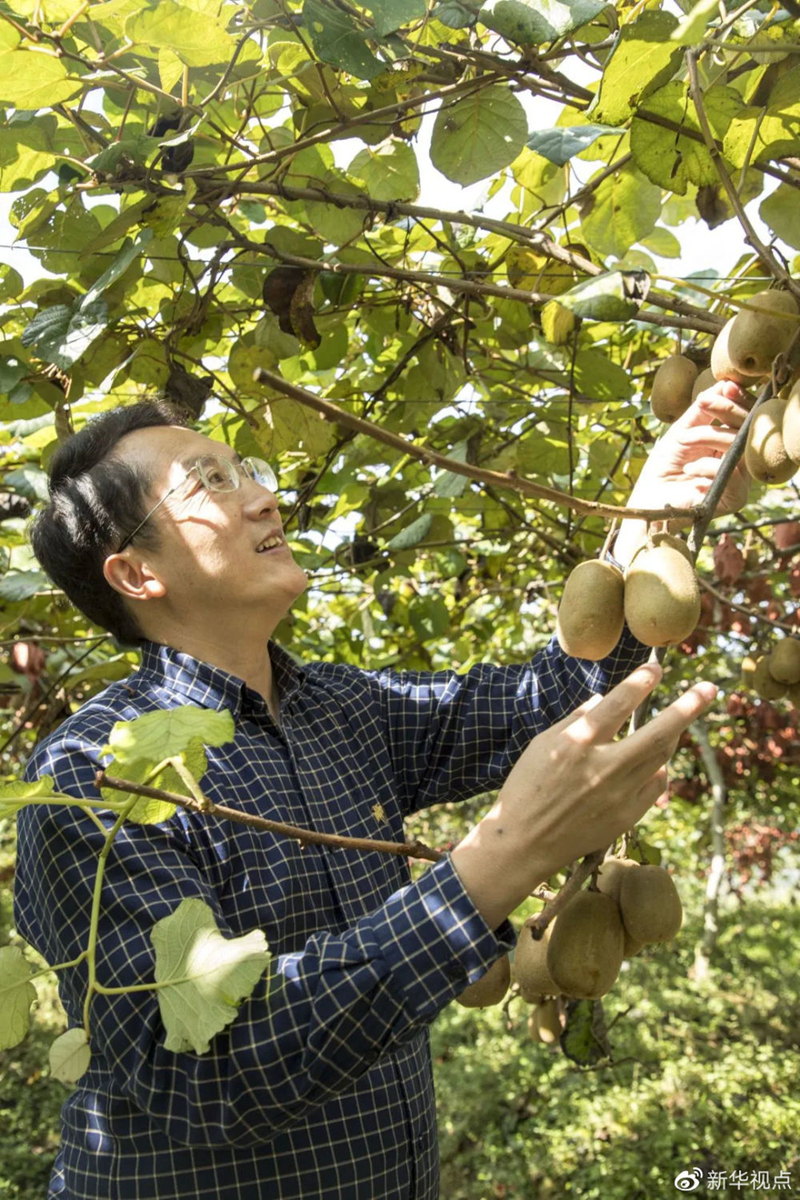 2018年,十八洞村第二任扶貧工作隊(duì)長石登高在十八洞村的獼猴桃產(chǎn)業(yè)基地查看獼猴桃長勢 新華社發(fā)