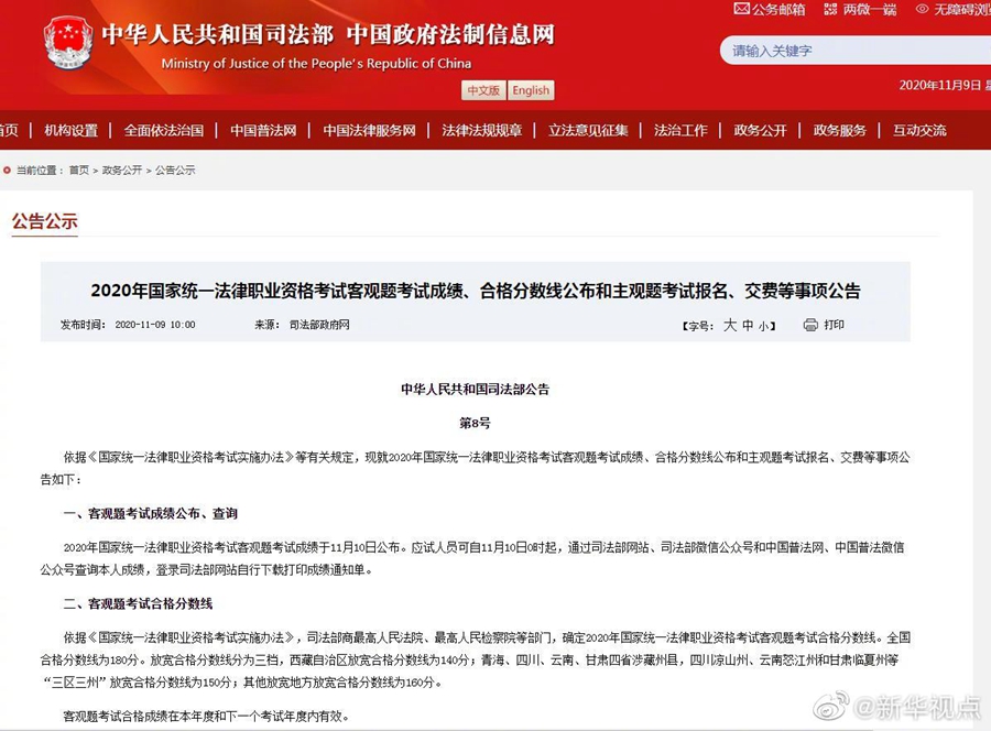 記者9日從司法部獲悉,2020年國家統(tǒng)一法律職業(yè)資格考試客觀題考試成績將于11月10日公布,全國合格分數(shù)線為180分。自11月10日0時起,應(yīng)試人員可通過司法部網(wǎng)站、司法部微信公眾號和中國普法網(wǎng)、中國普法微信公眾號查詢成績,登錄司法部網(wǎng)站自行下載打印成績通知單。通過2020年客觀題考試的應(yīng)試人員和2019年客觀題考試保留有效成績?nèi)藛T,應(yīng)于11月10日0時至11月14日24時,登錄司法部網(wǎng)站報名確認參加主觀題考試。(記者白陽)