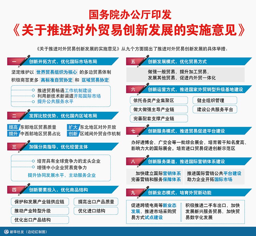 一是創(chuàng)新開(kāi)拓方式,優(yōu)化國(guó)際市場(chǎng)布局。堅(jiān)定維護(hù)以世界貿(mào)易組織為核心的多邊貿(mào)易體制,積極商簽更多高標(biāo)準(zhǔn)自貿(mào)協(xié)定和區(qū)域貿(mào)易協(xié)定。推進(jìn)貿(mào)易暢通工作機(jī)制建設(shè),利用新技術(shù)新渠道開(kāi)拓國(guó)際市場(chǎng),提升公共服務(wù)水平。二是發(fā)揮比較優(yōu)勢(shì),優(yōu)化國(guó)內(nèi)區(qū)域布局。提高東部地區(qū)貿(mào)易質(zhì)量,提升中西部地區(qū)貿(mào)易占比,擴(kuò)大東北地區(qū)對(duì)外開(kāi)放,創(chuàng)新區(qū)域間外貿(mào)合作機(jī)制。三是加強(qiáng)分類指導(dǎo),優(yōu)化經(jīng)營(yíng)主體。培育具有全球競(jìng)爭(zhēng)力的龍頭企業(yè),增強(qiáng)中小企業(yè)貿(mào)易競(jìng)爭(zhēng)力,提升協(xié)同發(fā)展水平,主動(dòng)服務(wù)企業(yè)。四是創(chuàng)新要素投入,優(yōu)化商品結(jié)構(gòu)。保護(hù)和發(fā)展產(chǎn)業(yè)鏈供應(yīng)鏈,推動(dòng)產(chǎn)業(yè)轉(zhuǎn)型升級(jí),優(yōu)化出口產(chǎn)品結(jié)構(gòu),提高出口產(chǎn)品質(zhì)量,優(yōu)化進(jìn)口結(jié)構(gòu)。五是創(chuàng)新發(fā)展模式,優(yōu)化貿(mào)易方式。做強(qiáng)一般貿(mào)易,提升加工貿(mào)易,發(fā)展其他貿(mào)易,促進(jìn)內(nèi)外貿(mào)一體化。六是創(chuàng)新運(yùn)營(yíng)方式,推進(jìn)國(guó)家外貿(mào)轉(zhuǎn)型升級(jí)基地建設(shè)。依托各類產(chǎn)業(yè)集聚區(qū),做大做強(qiáng)主導(dǎo)產(chǎn)業(yè)鏈,完善配套支撐產(chǎn)業(yè)鏈,健全組織管理,建設(shè)公共服務(wù)平臺(tái)。七是創(chuàng)新服務(wù)模式,推進(jìn)貿(mào)易促進(jìn)平臺(tái)建設(shè)。辦好進(jìn)博會(huì)、廣交會(huì)等一批綜合展會(huì),培育若干知名度高、影響力大的國(guó)際展會(huì)。培育進(jìn)口貿(mào)易促進(jìn)創(chuàng)新示范區(qū)。八是創(chuàng)新服務(wù)渠道,推進(jìn)國(guó)際營(yíng)銷體系建設(shè)。加快建立國(guó)際營(yíng)銷體系,完善營(yíng)銷和服務(wù)保障體系。推進(jìn)國(guó)際營(yíng)銷公共平臺(tái)建設(shè),助力企業(yè)開(kāi)拓國(guó)際市場(chǎng)。九是創(chuàng)新業(yè)態(tài)模式,培育外貿(mào)新動(dòng)能。促進(jìn)跨境電商等新業(yè)態(tài)發(fā)展,推進(jìn)市場(chǎng)采購(gòu)貿(mào)易方式試點(diǎn)建設(shè)。積極推進(jìn)二手車出口,加快發(fā)展新興服務(wù)貿(mào)易,加快貿(mào)易數(shù)字化發(fā)展。
