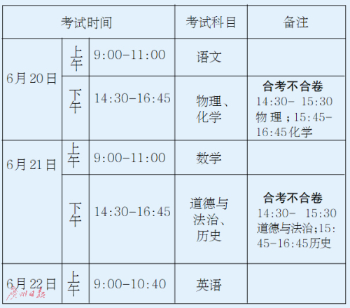 2021年至2023年廣州市初中學業(yè)水平考試錄取計分科目考試安排在每年的6月20日至22日進行。錄取計分科目采用“4+4”模式,新增歷史科考試,分值為90分,體育分值提升至70分。語、數(shù)、英各科分值調(diào)整為120分。道德與法治分值調(diào)整為90分。物理和化學分值不變,各100分。
