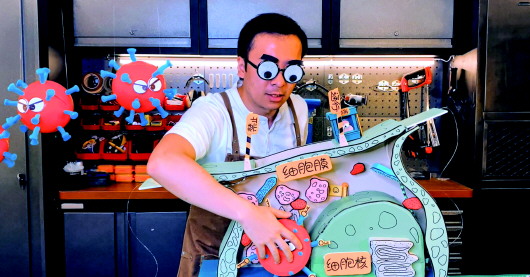“新型冠狀病毒在細(xì)胞外面游走過程中,總能找到對應(yīng)的鎖眼,咔嚓,打開細(xì)胞上的鎖,天真的細(xì)胞誤以為營養(yǎng)物質(zhì)來了,于是大門敞開……”在一個(gè)約4分鐘的視頻中,寧原在工作間的長桌上用自己制作的病毒、細(xì)胞等模型,為粉絲趣味介紹新型冠狀病毒是如何入侵人體的。他還邀請武漢大學(xué)醫(yī)學(xué)部病毒學(xué)研究所專家來釋疑病毒變異的相關(guān)問題,那期視頻獲得了500多萬次觀看量。