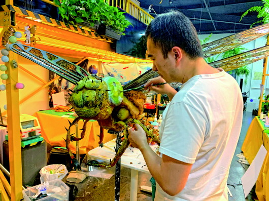 為了給人們解釋蜻蜓如何飛行覓食,寧原制作了一個(gè)放大數(shù)萬倍的彩色巨型“蜻蜓隊(duì)長”模型;為了展示蜘蛛織網(wǎng)的過程,他不僅制作了一個(gè)龐大的金色蜘蛛,還搭建了紙質(zhì)樹林立體展板,還原小蜘蛛在樹林中織網(wǎng)的場景,讓觀眾看完恍然大悟、大呼過癮。