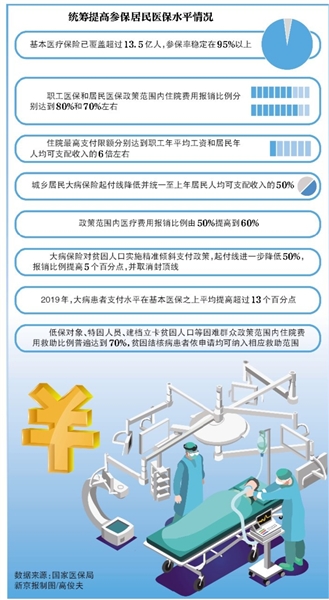 城鄉(xiāng)居民大病保險(xiǎn)起付線降低并統(tǒng)一至上年居民人均可支配收入的50%,政策范圍內(nèi)醫(yī)療費(fèi)用報(bào)銷比例由50%提高到60%。同時(shí),大病保險(xiǎn)對貧困人口實(shí)施精準(zhǔn)傾斜支付政策,起付線進(jìn)一步降低50%,報(bào)銷比例提高5個(gè)百分點(diǎn),并取消封頂線。2019年,大病患者支付水平在基本醫(yī)保之上平均提高超過13個(gè)百分點(diǎn)。