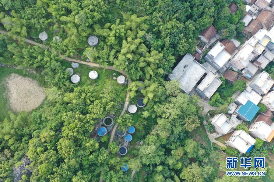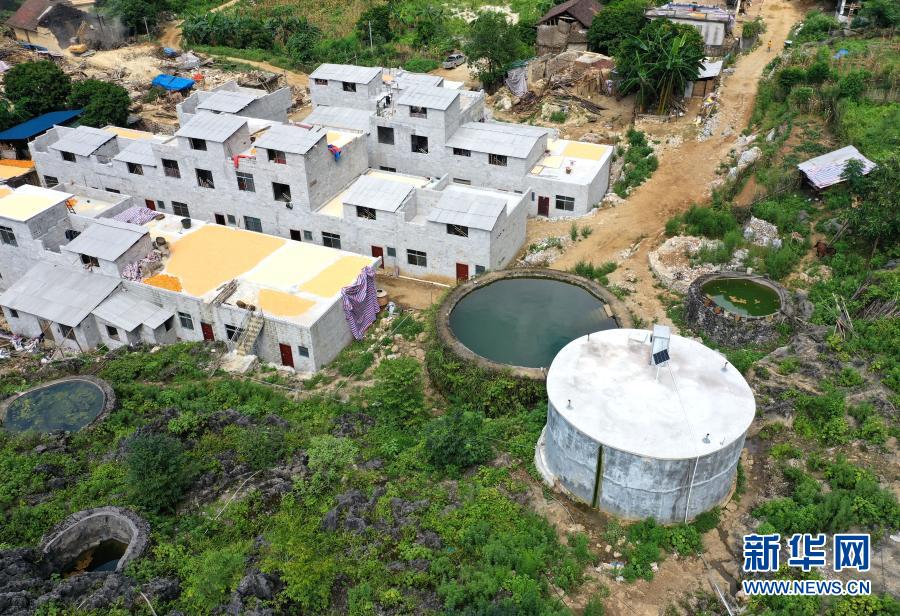 這是7月23日在廣西都安瑤族自治縣三只羊鄉(xiāng)雞峒村拍攝的水柜(無人機照片)。利用山石修建的第1代水柜、用水泥砂石修建的第2水柜以及第3代加蓋并配備抽水設(shè)備的水柜,見證了大石山區(qū)村民飲水的變遷。新華社記者 周華 攝