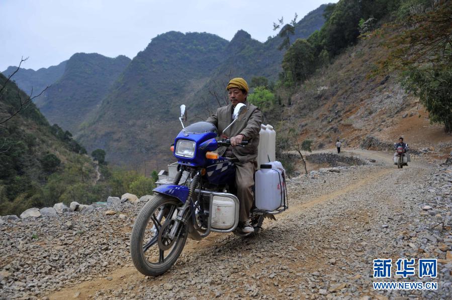 一名取水村民騎行在廣西巴馬瑤族自治縣東山鄉(xiāng)文錢村的山路上(2010年3月7日攝)。新華社記者 周華 攝