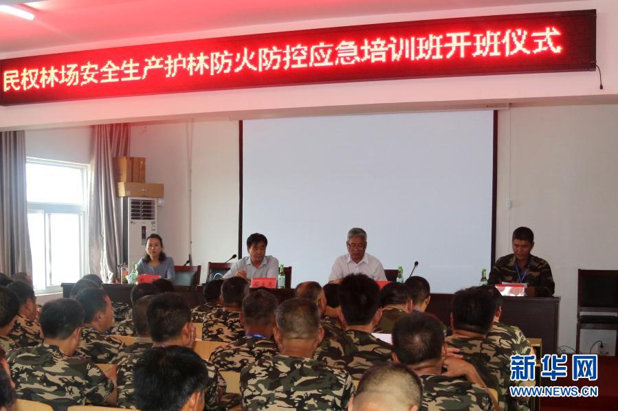 石立忠(臺上左二)和翟文杰(臺上右一)在民權林場安全生產護林防火防控應急培訓班開班儀式上(資料照片)。新華社發(fā)