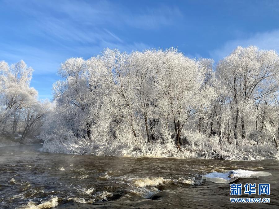 遜克縣位于黑龍江省北部,冬季漫長而寒冷。當(dāng)?shù)貛鞝枮I水電站放水時(shí),水遇冷形成霧氣,落到樹枝上凝結(jié)成霜花,在平臺(tái)村周邊形成綿延的霧凇景觀。