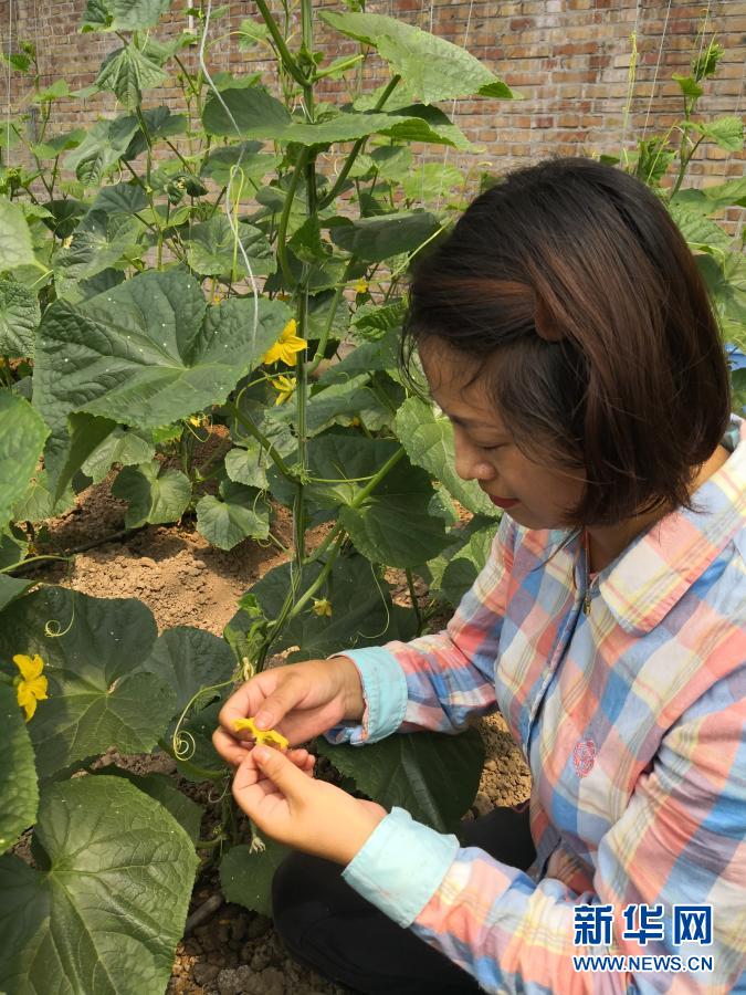 李愚鶴在田間進行人工授粉(2019年6月27日攝)。新華社發(fā)(天津科潤黃瓜研究所供圖)