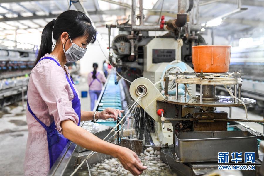 工人在廣西凌云縣一家繅絲廠內煮繭抽絲(4月17日攝)。新華社記者 曹祎銘 攝