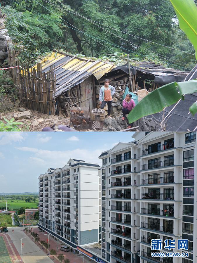 這是一張拼版照片,上圖為:2018年11月11日在廣西田東縣思林鎮(zhèn)龍邦村拍攝的村民和自家簡陋的房屋(思林鎮(zhèn)政府供圖);下圖為:2019年8月28日拍攝的當地為龍邦村新建的位于廣西田東縣思林鎮(zhèn)的易地扶貧搬遷安置點(無人機照片,新華社記者 曹祎銘 攝)。新華社發(fā)