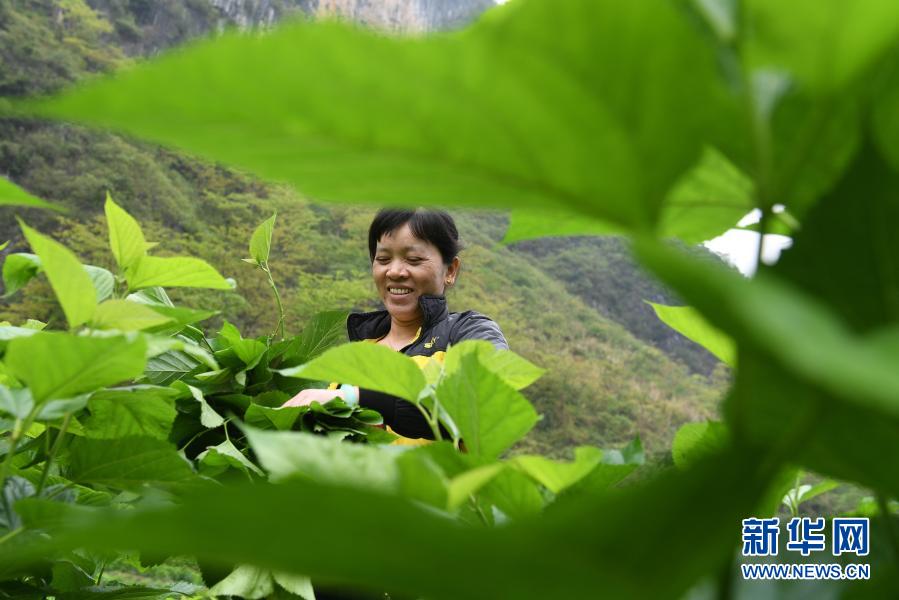 在廣西百色市凌云縣下甲鎮(zhèn)加西村,當地村民在采摘桑葉(2019年3月27日攝)。新華社記者 陸波岸 攝