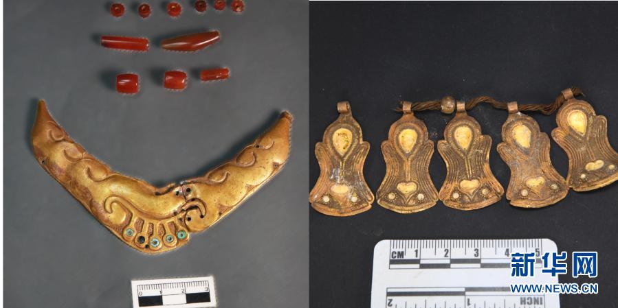 桑達隆果墓地出土的金項飾、瑪瑙等(資料照片)。新華社發(fā)