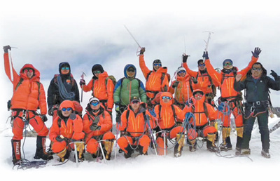 2020珠峰高程測量登山隊隊員開展峰頂覘標操作練習。自然資源部供圖
