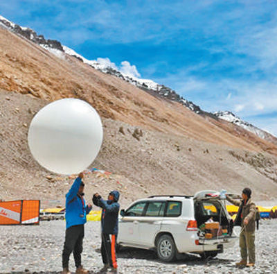 西藏自治區(qū)氣象局2020珠峰高程測量氣象探測保障服務隊施放高空氣象探測氣球。自然資源部供圖