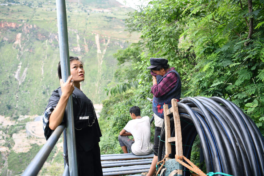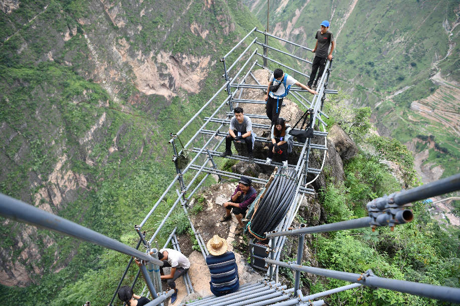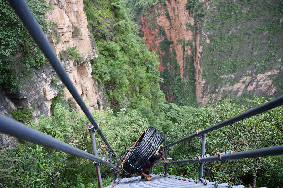 2017年9月初,四川涼山“懸崖村”村民背貨物通過天梯上山。四川省涼山州昭覺縣支爾莫鄉(xiāng)阿土列爾村,坐落于海拔約1600米的山坳中,從山底到山頂村莊海拔高差近1000米,村民往返村子都需要借助懸崖峭壁間的天梯,從而被稱為“懸崖村”。為緩解村民出行險(xiǎn)的問題,當(dāng)?shù)赝度?20噸鋼材、共6000根鋼管修筑了2556級“鋼管天梯”,工程于2017年6月底徹底完工,如今,“鋼管天梯”已經(jīng)取代了之前更危險(xiǎn)的藤梯,成為村民通往外界唯一的道路。 張浪 攝