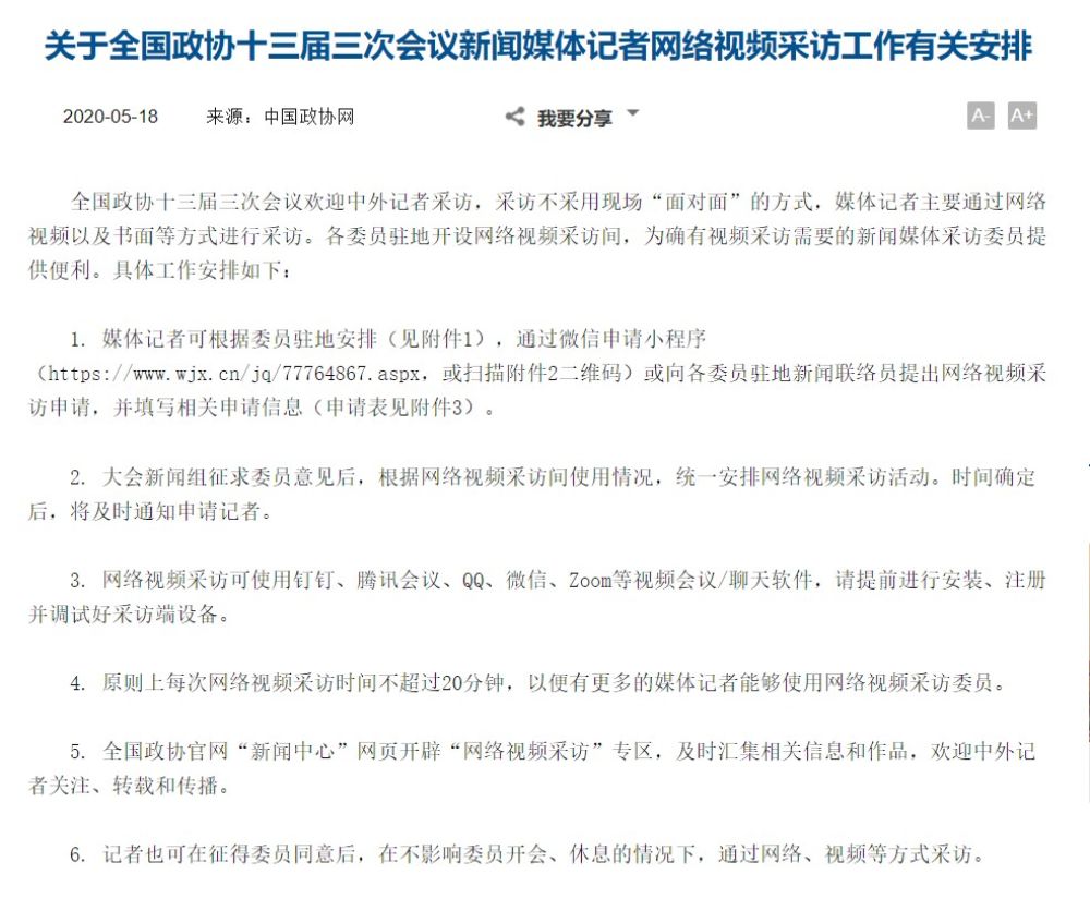 考慮到疫情防控要求和會期安排,今年全國兩會特別增添了采訪新則:“不采用‘面對面’的方式”,主要通過網絡視頻和書面等形式進行采訪。