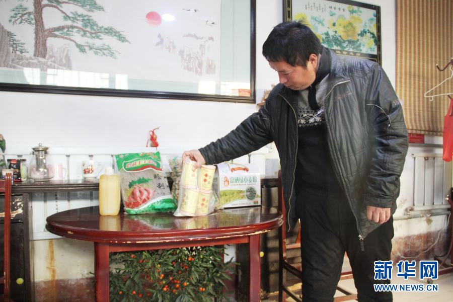 1月3日,在山東高唐縣清平鎮(zhèn)高寨村,于福強在整理家中等待出售的當(dāng)?shù)赝撂禺a(chǎn)。新華社記者 陳灝 攝