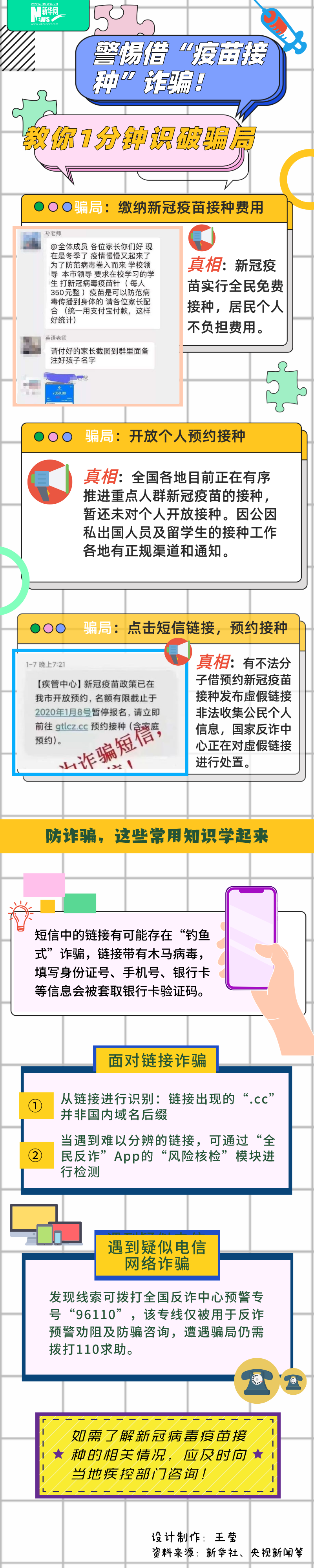 近期,全國多地有序開展新冠病毒疫苗接種,一些不法分子從中嗅到了“機(jī)會”,借疫苗接種設(shè)局實(shí)施詐騙,快來識破這些騙局!