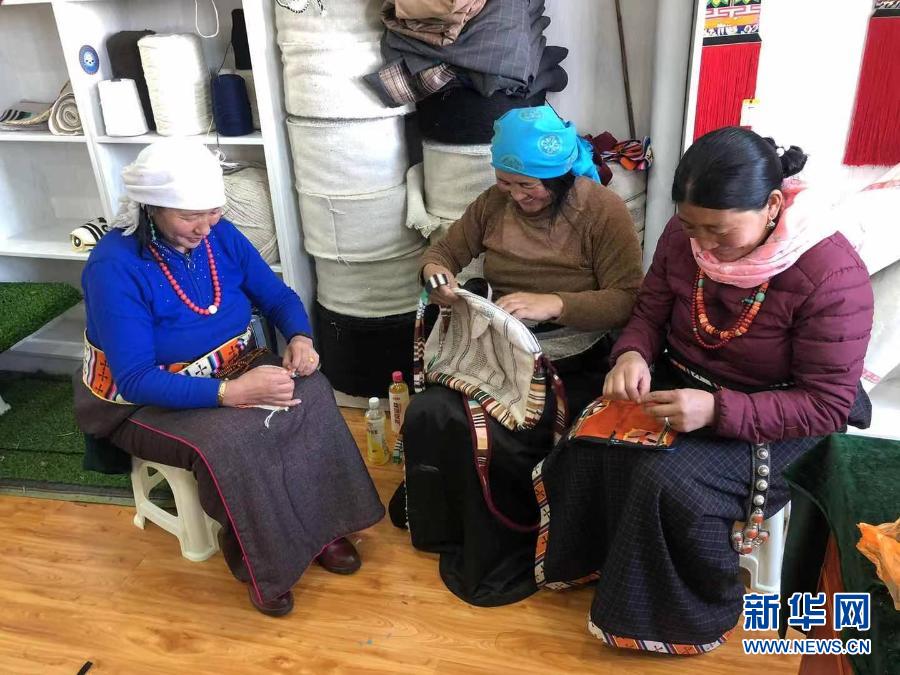 在青海省果洛藏族自治州瑪沁縣的扶貧產(chǎn)業(yè)孵化園內,贊根村村民在制作手工藝品(2020年11月9日攝)。新華社發(fā)