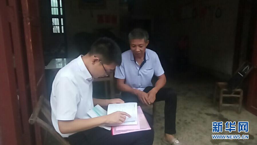 吳應(yīng)譜(左)在走訪貧困戶(資料照片)。新華社發(fā)(修水縣委宣傳部供圖)