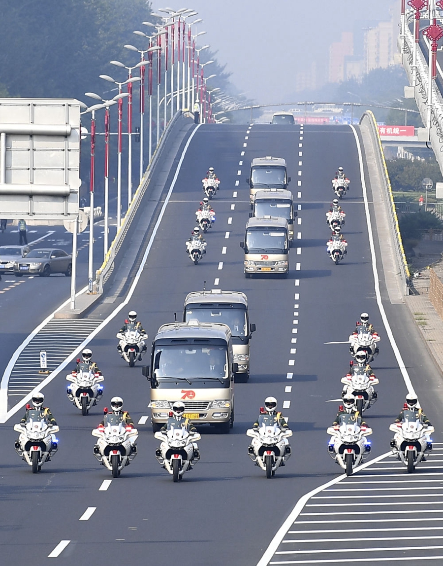 29日上午,國家勛章和國家榮譽稱號獲得者集體乘坐禮賓車從住地出發(fā),在英姿颯爽的國賓護衛(wèi)隊護衛(wèi)下,匯成一列車隊,向人民大會堂進發(fā)。