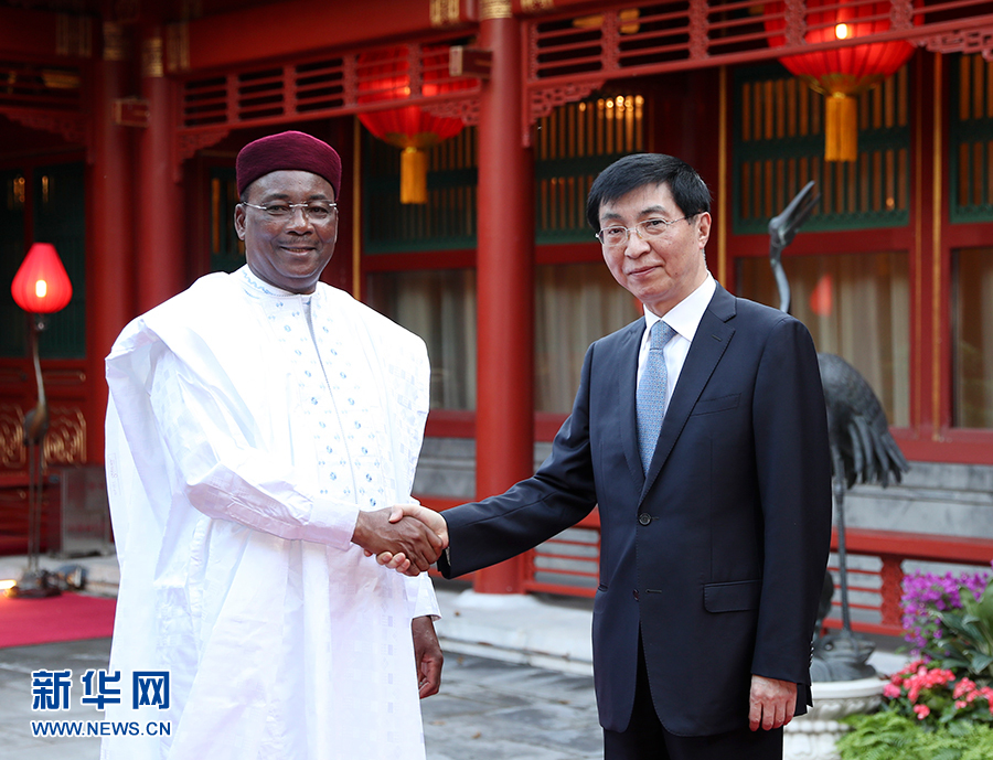 8月31日,中共中央政治局常委、中央書記處書記王滬寧在北京釣魚臺國賓館會見尼日爾總統(tǒng)伊素福。 新華社記者丁海濤攝