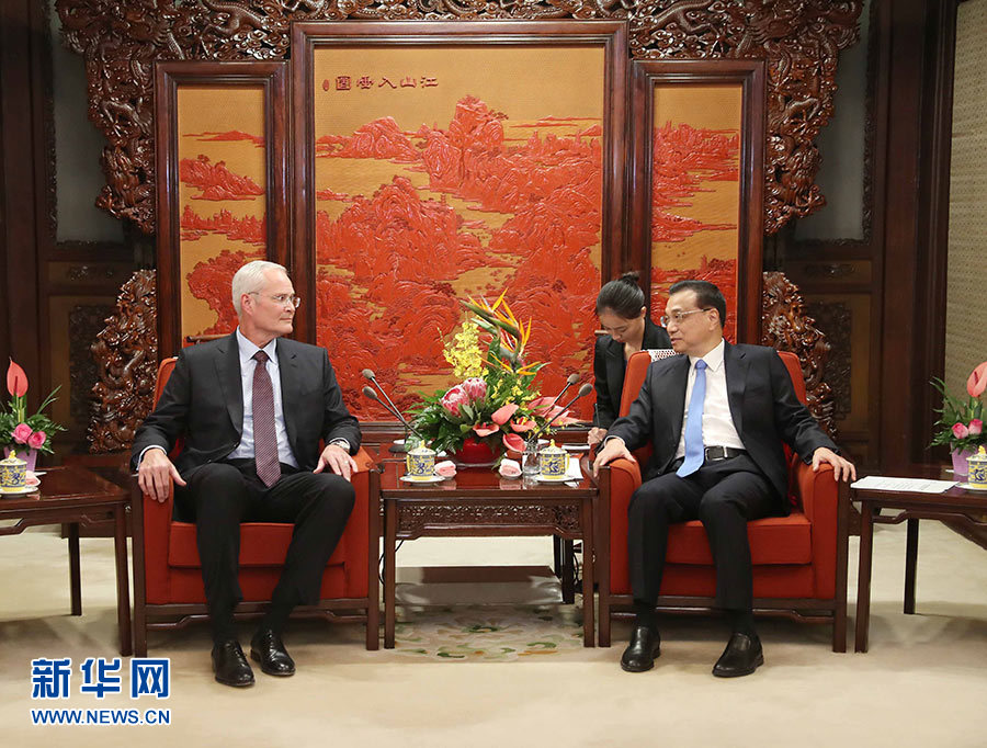 9月7日,國務(wù)院總理李克強(qiáng)在北京中南海紫光閣會(huì)見美國??松梨诠径麻L兼首席執(zhí)行官伍德倫。 新華社記者 劉衛(wèi)兵 攝