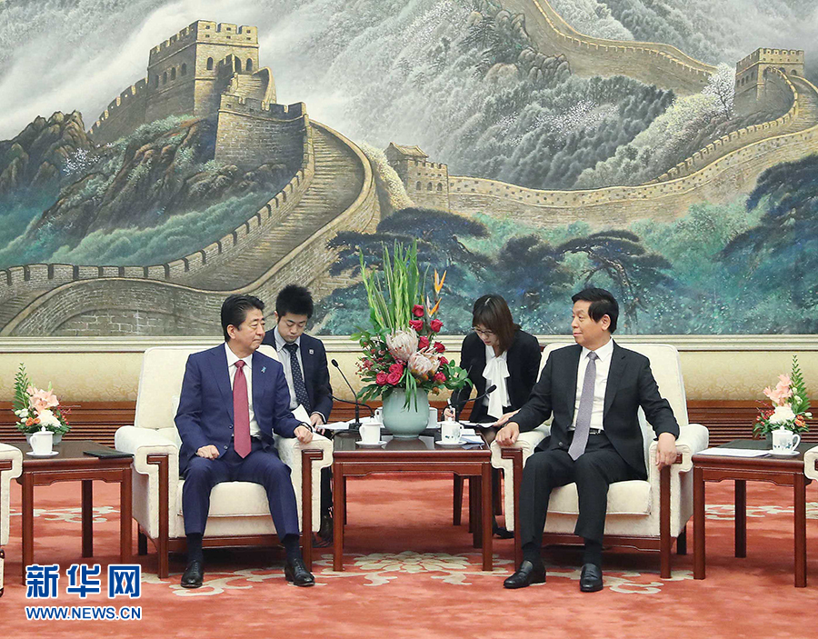 10月26日,全國(guó)人大常委會(huì)委員長(zhǎng)栗戰(zhàn)書(shū)在北京人民大會(huì)堂會(huì)見(jiàn)日本首相安倍晉三。 新華社記者劉衛(wèi)兵攝