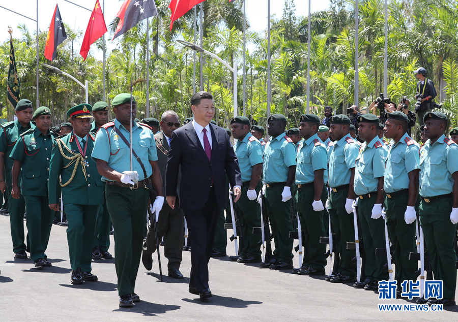 11月16日,國(guó)家主席習(xí)近平在莫爾茲比港會(huì)見(jiàn)巴布亞新幾內(nèi)亞總督達(dá)達(dá)埃。會(huì)見(jiàn)開(kāi)始前,達(dá)達(dá)埃在議會(huì)大廈前廣場(chǎng)為習(xí)近平舉行隆重歡迎儀式。新華社記者 鞠鵬 攝