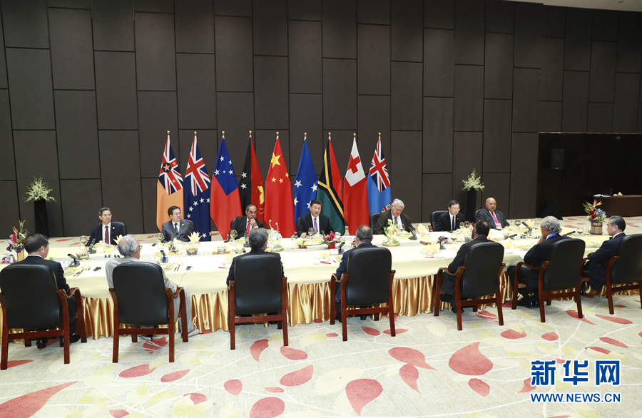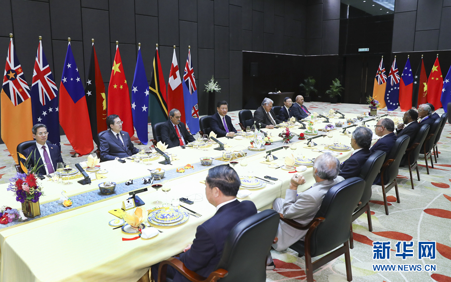 11月16日,國家主席習(xí)近平在莫爾茲比港同巴布亞新幾內(nèi)亞總理奧尼爾、密克羅尼西亞聯(lián)邦總統(tǒng)克里斯琴、薩摩亞總理圖伊拉埃帕、瓦努阿圖總理薩爾瓦伊、庫克群島總理普納、湯加首相波希瓦、紐??偫硭冉ń惶窖髰u國領(lǐng)導(dǎo)人以及斐濟(jì)政府代表、國防部長昆布安博拉舉行集體會晤。習(xí)近平主持會晤并發(fā)表主旨講話。 新華社記者 謝環(huán)馳 攝