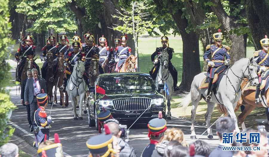 習(xí)近平和夫人彭麗媛在馬隊(duì)護(hù)衛(wèi)下前往總統(tǒng)官邸,禮兵在林蔭大道兩側(cè)列隊(duì)接受檢閱。抵達(dá)榮譽(yù)廣場(chǎng)時(shí),軍樂(lè)團(tuán)奏響歡快的進(jìn)行曲。馬克里和夫人阿瓦達(dá)上前熱情迎接。兩國(guó)元首夫婦登上檢閱臺(tái)。軍樂(lè)團(tuán)奏中國(guó)、阿根廷兩國(guó)國(guó)歌。