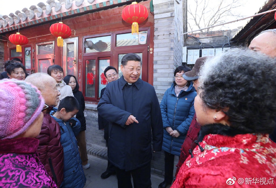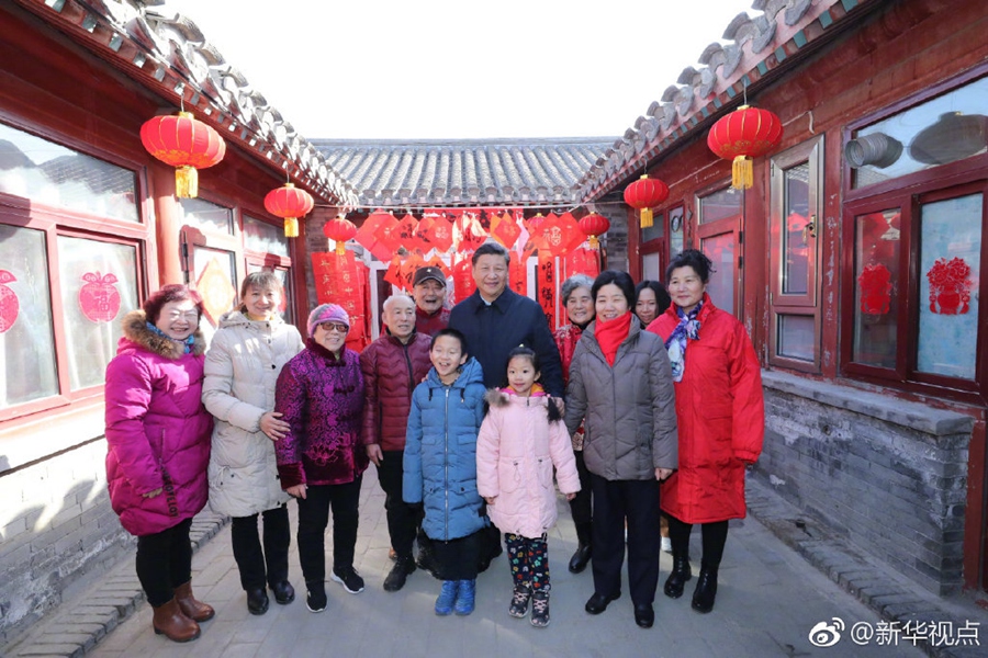 2月1日上午,習(xí)近平來到前門東區(qū),沿草廠四條胡同步行察看街巷風(fēng)貌,聽取區(qū)域規(guī)劃建設(shè)、舊城保護整治、人居環(huán)境改善等情況介紹,先后走進兩個四合院看望,同這里的居民一起包餃子、炸饹馇、貼“?!弊?、聊家常,仔細詢問住房環(huán)境有沒有改善、年貨備齊沒有、生活還有什么困難,祝他們生活幸福、新春快樂。四合院里笑語歡聲,習(xí)近平對他們說,中國共產(chǎn)黨的追求就是讓老百姓生活越來越好。(記者張曉松、鞠鵬)