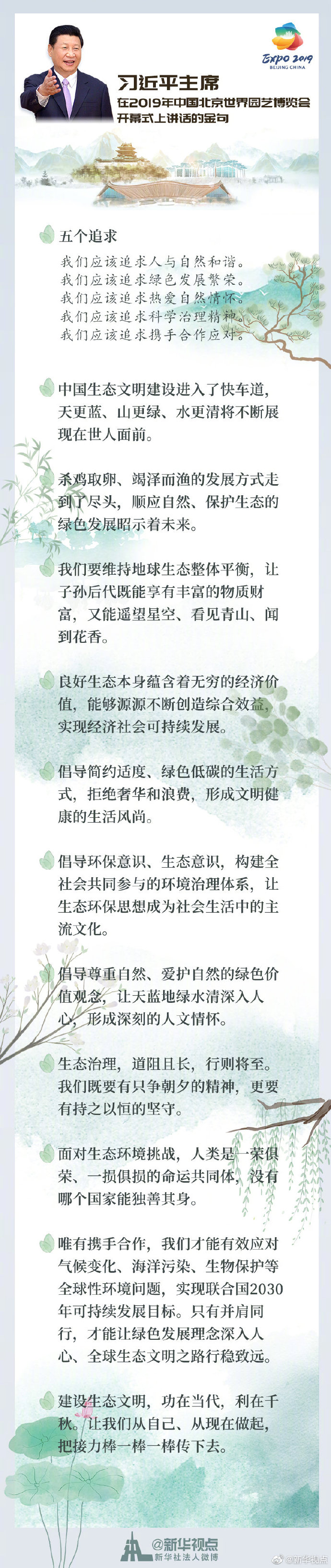 習近平主席28日出席2019年中國北京世界園藝博覽會開幕式并發(fā)表講話,傳遞的綠色發(fā)展理念直抵人心。詳情請戳圖看金句↓ ????