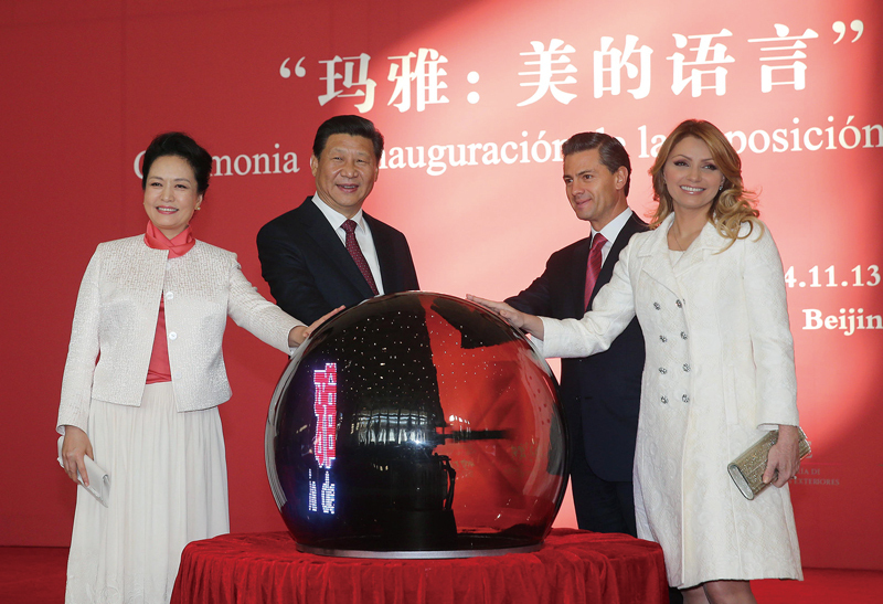 2014年11月13日,國(guó)家主席習(xí)近平同墨西哥總統(tǒng)培尼亞共同出席在國(guó)家博物館舉行的“瑪雅:美的語(yǔ)言”文化展開(kāi)幕式。這是習(xí)近平和夫人彭麗媛與培尼亞夫婦一同為展覽剪彩。 新華社記者 劉衛(wèi)兵/攝