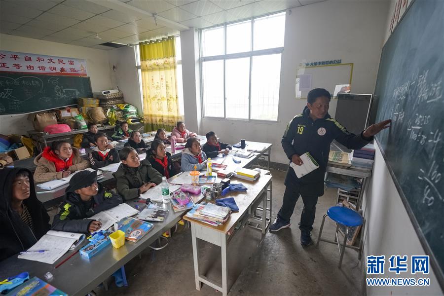 瓦吾小學(xué)教師曲比史古(右一)在給五年級學(xué)生上數(shù)學(xué)課(5月27日攝)。新華社記者 沈伯韓 攝