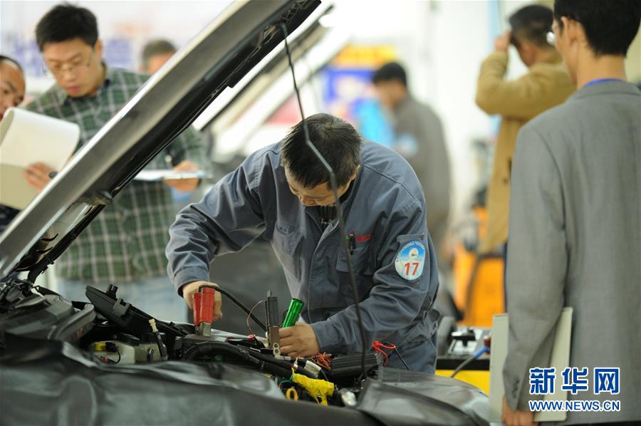 參賽選手在貴陽市第二屆技能之星競技大賽決賽汽車維修項目比賽中(2015年11月17日攝)。大賽吸引5000余名來自貴州省中、高等職業(yè)院校的學(xué)生參加。新華社記者 陶亮 攝