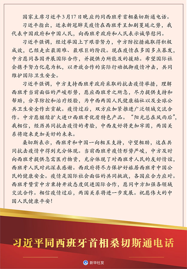 習(xí)近平強調(diào),中方支持西班牙政府采取的抗擊疫情舉措,理解西班牙當前面臨的嚴峻形勢,愿應(yīng)西班牙之所急,盡力提供支持和幫助,分享防控和治療經(jīng)驗,為中西兩國人民健康福祉以及全球公共衛(wèi)生安全作出貢獻。疫情過后,雙方應(yīng)加緊推進廣泛領(lǐng)域交流合作。中方愿繼續(xù)擴大進口西班牙優(yōu)質(zhì)特色產(chǎn)品。“陽光總在風(fēng)雨后”,我相信,經(jīng)歷共同抗擊疫情的考驗,中西友好將更加牢固,兩國關(guān)系將迎來更加美好的未來。