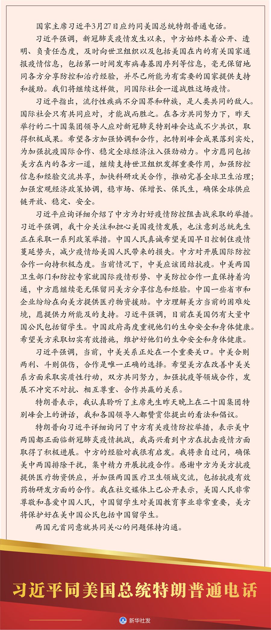 習近平應(yīng)詢詳細介紹了中方為打好疫情防控阻擊戰(zhàn)采取的舉措。習近平強調(diào),我十分關(guān)注和擔心美國疫情發(fā)展,也注意到總統(tǒng)先生正在采取一系列政策舉措。中國人民真誠希望美國早日控制住疫情蔓延勢頭,減少疫情給美國人民帶來的損失。中方對開展國際防控合作一向持積極態(tài)度。當前情況下,中美應(yīng)該團結(jié)抗疫。中美兩國衛(wèi)生部門和防控專家就國際疫情形勢、中美防控合作一直保持著溝通,中方愿繼續(xù)毫無保留同美方分享信息和經(jīng)驗。中國一些省市和企業(yè)紛紛在向美方提供醫(yī)療物資援助。中方理解美方當前的困難處境,愿提供力所能及的支持。習近平強調(diào),目前在美國仍有大量中國公民包括留學生。中國政府高度重視他們的生命安全和身體健康。希望美方采取切實有效措施,維護好他們的生命安全和身體健康。