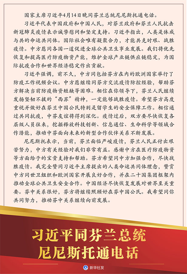 習(xí)近平代表中國政府和中國人民,對芬蘭政府和芬蘭人民抗擊新冠肺炎疫情表示誠摯慰問和堅定支持。習(xí)近平指出,人類是休戚與共的命運共同體。國際社會唯有凝聚合力,才能共克時艱、戰(zhàn)勝疫情。中方愿同各國一道促進(jìn)全球公共衛(wèi)生事業(yè)發(fā)展。我們將優(yōu)先恢復(fù)和提高醫(yī)療防疫物資產(chǎn)能,維護(hù)全球產(chǎn)業(yè)鏈供應(yīng)鏈穩(wěn)定,為國際抗疫合作和世界經(jīng)濟(jì)穩(wěn)定作出貢獻(xiàn)。