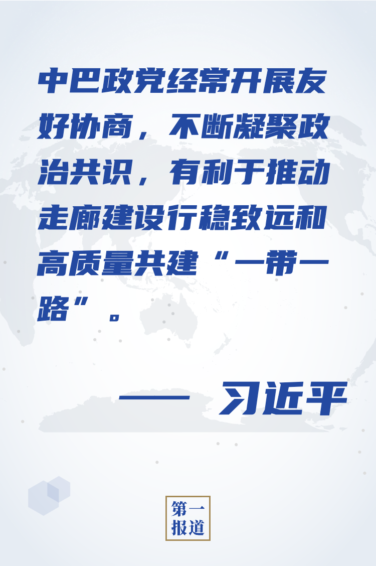 習(xí)近平指出,中巴是有著特殊友好情誼的好兄弟、好伙伴。中巴經(jīng)濟走廊是“一帶一路”建設(shè)的標(biāo)志性項目,對推動中巴全天候戰(zhàn)略合作伙伴關(guān)系深入發(fā)展、打造更加緊密的中巴命運共同體具有重要意義。中巴政黨經(jīng)常開展友好協(xié)商,不斷凝聚政治共識,有利于推動走廊建設(shè)行穩(wěn)致遠和高質(zhì)量共建“一帶一路”。