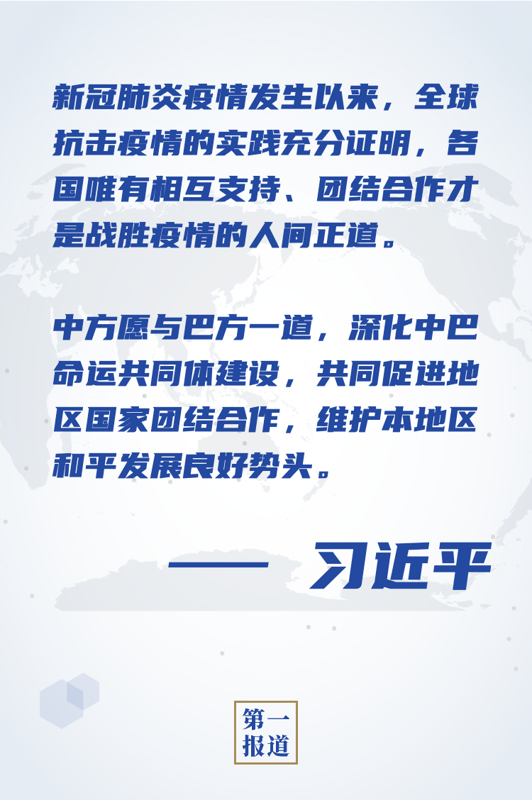 習(xí)近平強調(diào),新冠肺炎疫情發(fā)生以來,全球抗擊疫情的實踐充分證明,各國唯有相互支持、團結(jié)合作才是戰(zhàn)勝疫情的人間正道。中方愿與巴方一道,深化中巴命運共同體建設(shè),共同促進地區(qū)國家團結(jié)合作,維護本地區(qū)和平發(fā)展良好勢頭。