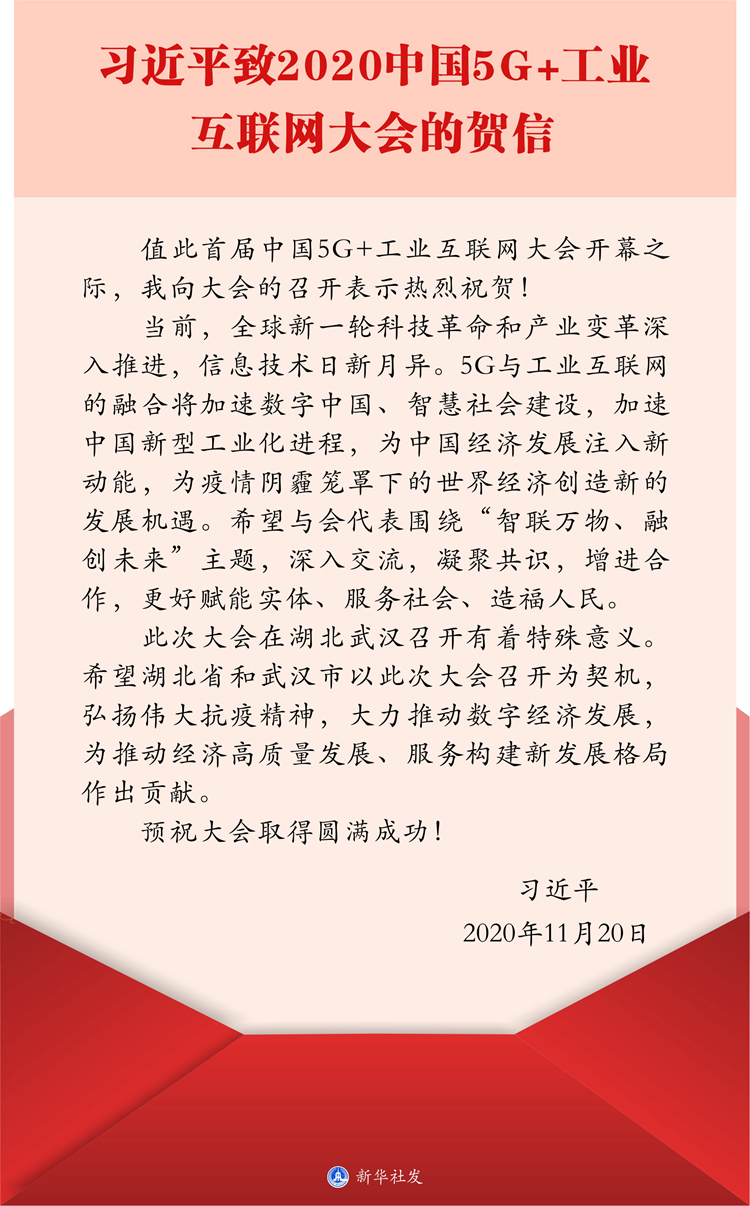 新華社武漢11月20日電 2020中國5G+工業(yè)互聯(lián)網(wǎng)大會20日在湖北省武漢市開幕。中共中央總書記、國家主席、中央軍委主席習(xí)近平發(fā)來賀信,向大會的召開表示熱烈祝賀。