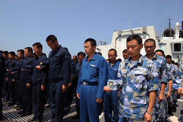 中國海軍護(hù)航編隊(duì)舉行默哀儀式悼念舟曲特大山洪泥石流遇難同胞