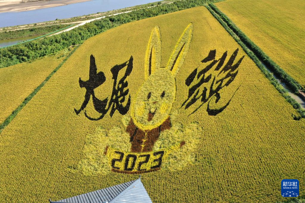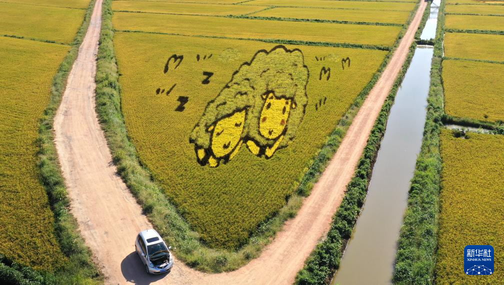 初秋时节,辽宁省鞍山市台安县辽河文化旅游景区的稻田画吸引不少游客前来参观游览。由多种颜色组成的巨型稻田画勾勒出丰收壮美景象。