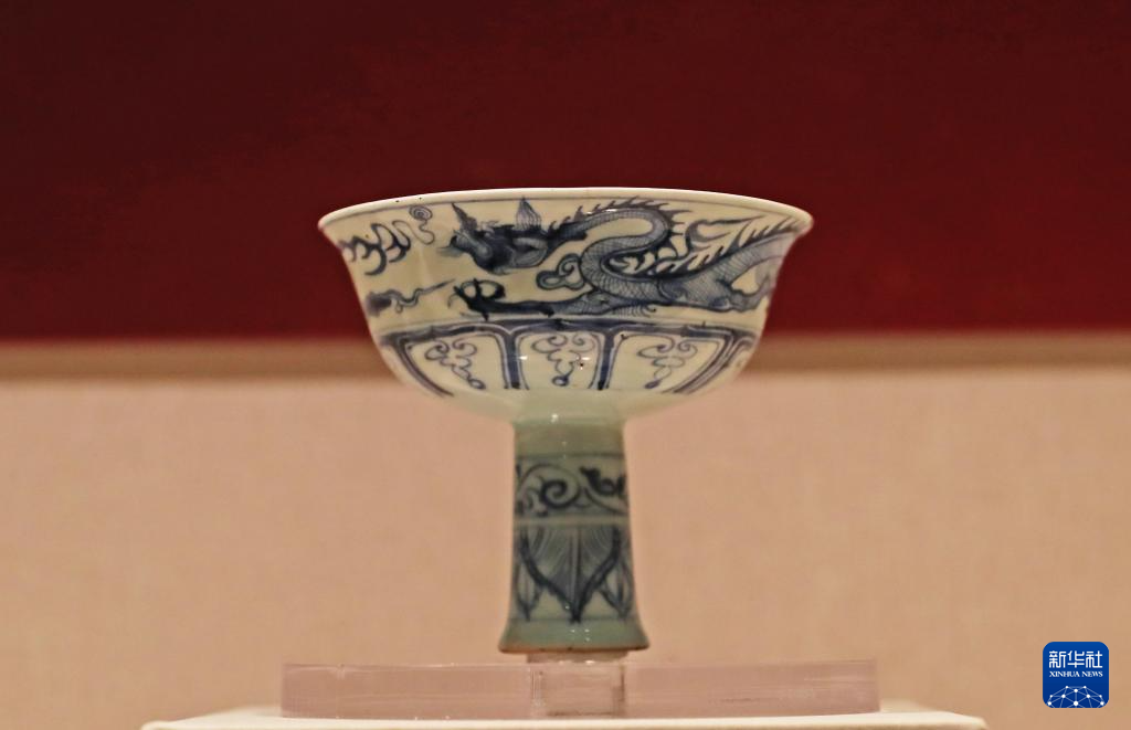 2月2日在辽宁省博物馆拍摄的青花云龙纹高足杯。