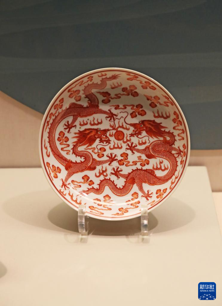 2月2日在辽宁省博物馆拍摄的矾红彩双龙戏珠纹盘。