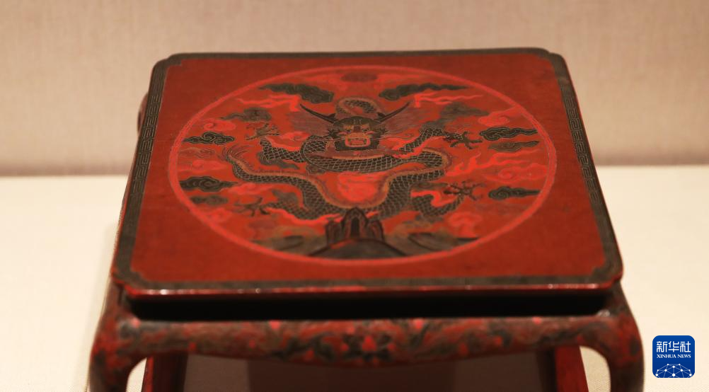 2月2日在辽宁省博物馆拍摄的平涂朱漆雕云龙小方几。