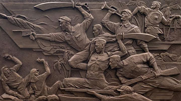 这是解放军文工团雕塑创作员郎钺创作的,以东江纵队抗战为背景的浮雕《南粤烽火 卫士先驱》。