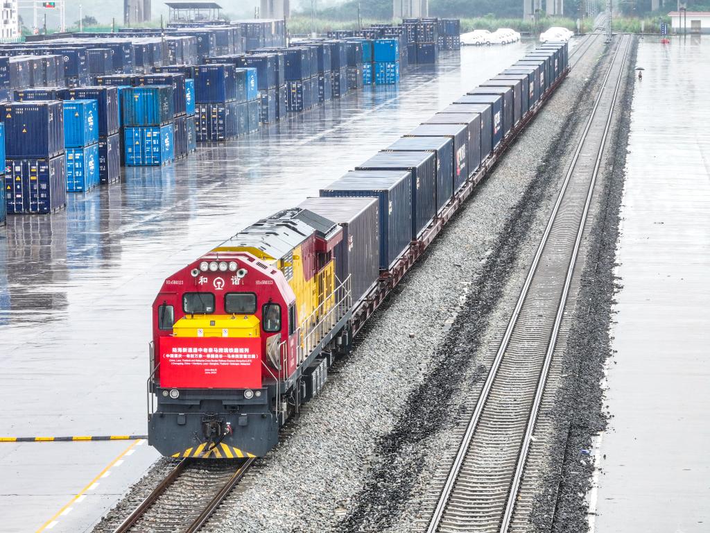 2024年6月27日,西部陆海新通道中老泰马跨境铁路班列在重庆江津小南垭站等待发车(无人机照片)。新华社记者 唐奕 摄