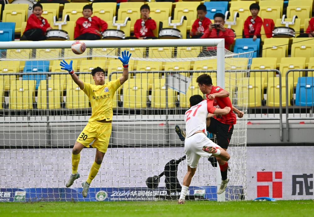 11月2日,成都蓉城队球员董岩锋(右)在2024赛季中国足球协会超级联赛第30轮比赛中头球破门。新华社发(尹钢摄)
